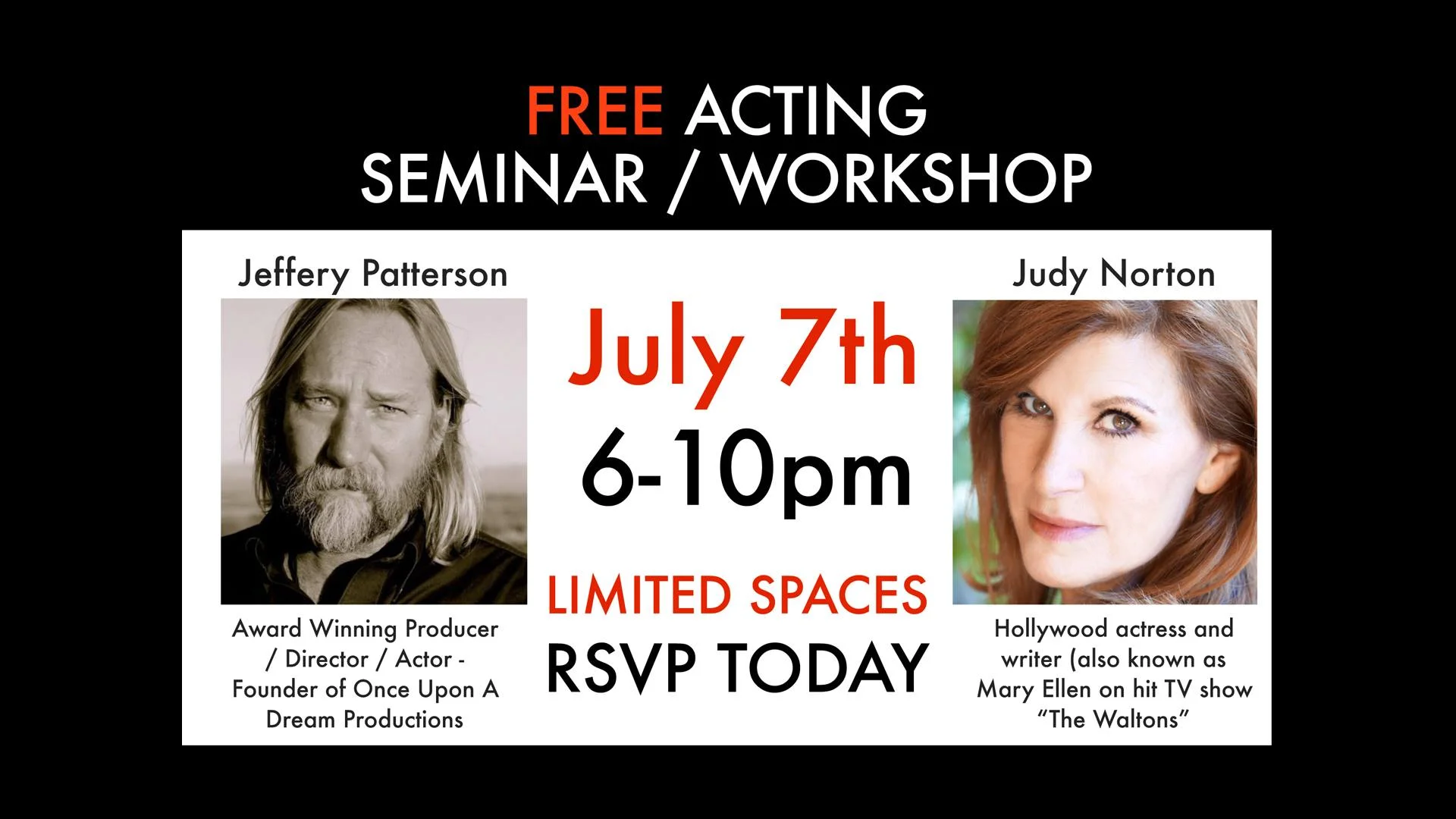 Take your acting to the next level and learn from award winning Hollywood actor and award winning director / producer. Jeffery Patterson and Judy Norton will be teaching a FREE Acting Seminar & Workshop at The Whole Backstage Theatre on Friday, July 7th from 6pm to 10pm!